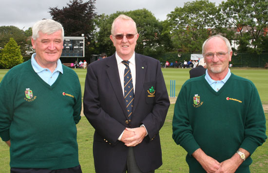 Umpires Connie McAllister and Charlie McElwee with Tom Prior